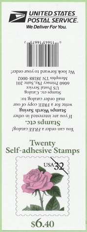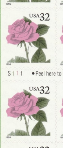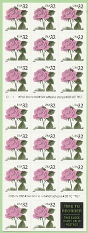 | Official Announcement | The 32-cent Rose self-adhesive convertible booklet goes on sale June 2, 1995, in McLean, VA. This stamp design depicts a single pink rose and USA 32. A future Postal Bulletin will include collector information. |