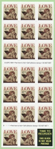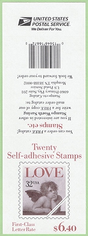 | Official Announcement | The Postal Service will issue a 32-cent Love Cherub stamp, in a convertible booklet of 20 self-adhesive stamps (Item 6672), a 32-cent Flag Over Porch stamp, in a convertible booklet of 10 self-adhesive stamps (Item 6609), and a 1-cent American Kestrel stamp, in coils of 500 (Item 7961) and 3,000 (Item 7962), on January 20, 1996, in New York, New York. The stamp and stamp booklets go on sale nationwide January 22. No official dedication ceremony is planned. The Love Cherub stamp, designed by Terry McCaffrey of the U.S. Postal Service, features one of the two cherubs from Raphaels Sistine Madonna painting. The design is the same as the stamp issued on February 1, 1995, but includes the denomination. |