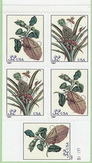 4. Designed by Phil Jordan of Falls Church, Virginia, the stamps feature two hand-colored engravings, one of a pineapple and one of a citron, from original watercolors done by artist Maria Sibylla Merian (16471717). Merian spent 2 years in Surinam studying and painting insects, plants, and animals. Her first edition book, Metamorphosis of Insects of Surinam, published in 1705, resulted in the firm establishment of her reputation as a scientist as well as an artist. |