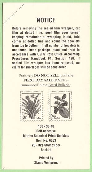 issue two 32-cent Merian Botanical Prints stamps, in a self-adhesive vendible booklet of