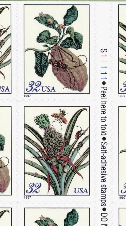 4. Designed by Phil Jordan of Falls Church, Virginia, the stamps feature two hand-colored engravings, one of a pineapple and one of a citron, from original watercolors done by artist Maria Sibylla Merian (16471717). Merian spent 2 years in Surinam studying and painting insects, plants, and animals. Her first edition book, Metamorphosis of Insects of Surinam, published in 1705, resulted in the firm establishment of her reputation as a scientist as well as an artist. |