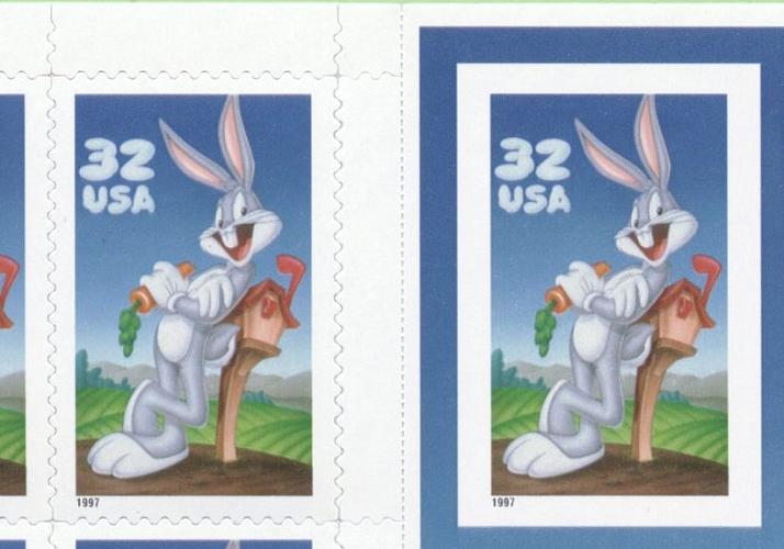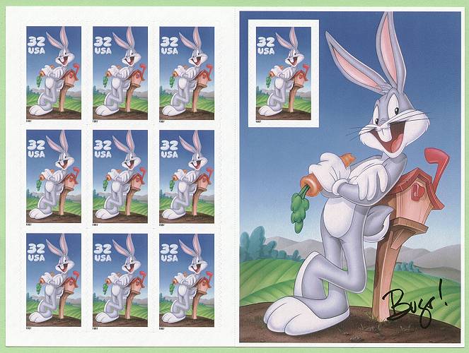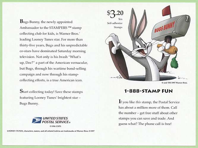 Official Announcement | The Postal Service will issue a self-adhesive souvenir sheet of ten 32-cent Bugs Bunny commemorative stamps (Item 5588) on May 22, 1997, in Burbank, California. The stamps go on sale nationwide May 23 and will only be sold as a souvenir sheet. No individual stamps are available. Designed and illustrated by Warner Bros., a Time Warner entertainment company, the stamp features the cartoon character Bugs Bunny, leaning against a rural mail box and holding his trademark carrot. Bugs Bunny will serve as the official ambassador for STAMPERSE, the Postal Services new stamp collecting program for children. |