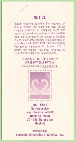 The Washington, D.C.; Memphis, Tennessee; Chicago, Illinois; Denver, Colorado; and San Francisco, California accountable paper depositories (APDs) will receive 1,107,000 booklets of the 32-cent Love Swan stamp (Item 6680) and the New York, New York APD and Kansas City SDN will receive 1,111,500 booklets of the 32-cent Love Swan stamp for filling supplemental orders. All APDs and the Kansas City SDN will receive 738,000 booklets of the 55-cent Love Swan stamp (Item 6681) for filling supplemental orders.