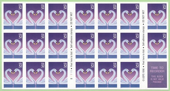 on sale nationwide the same day. Designed by Marvin Mattelson of Great Neck, New York, the stamps feature two swans facing each other, creating the shape of a heart. |