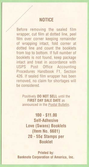 The Washington, D.C.; Memphis, Tennessee; Chicago, Illinois; Denver, Colorado; and San Francisco, California accountable paper depositories (APDs) will receive 1,107,000 booklets of the 32-cent Love Swan stamp (Item 6680) and the New York, New York APD and Kansas City SDN will receive 1,111,500 booklets of the 32-cent Love Swan stamp for filling supplemental orders. All APDs and the Kansas City SDN will receive 738,000 booklets of the 55-cent Love Swan stamp (Item 6681) for filling supplemental orders.