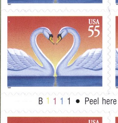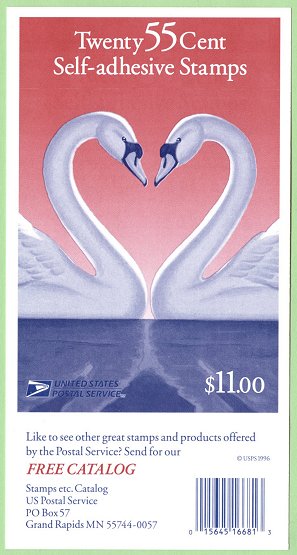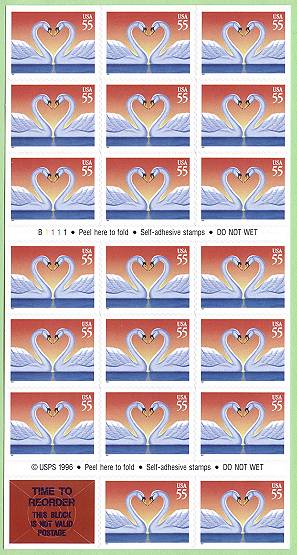 on sale nationwide the same day. Designed by Marvin Mattelson of Great Neck, New York, the stamps feature two swans facing each other, creating the shape of a heart. |