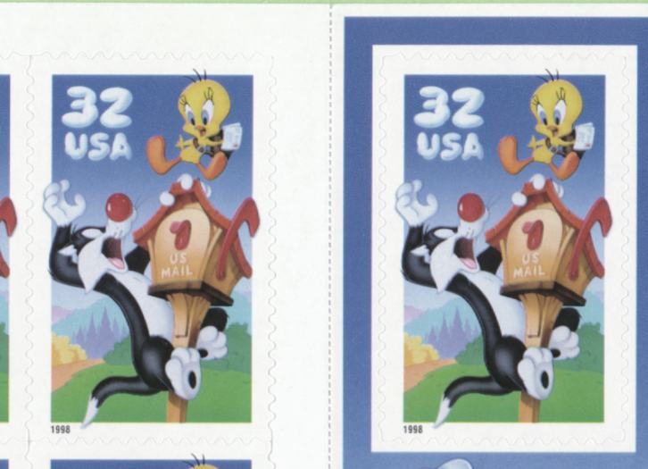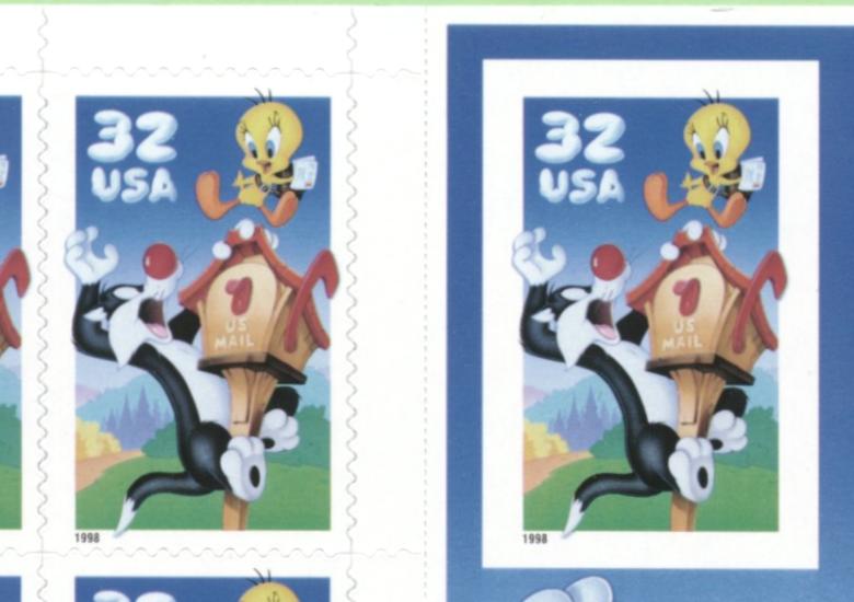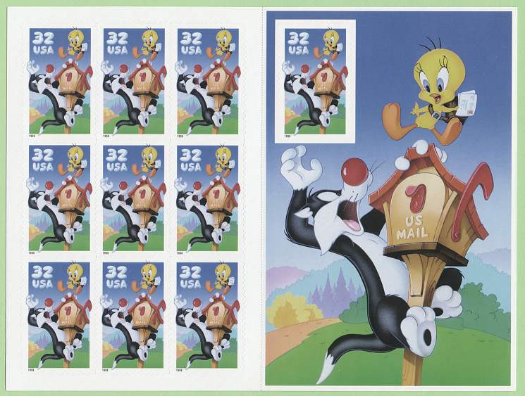Official Announcement | The Postal Service will issue a self-adhesive souvenir sheet of ten 32-cent Sylvester & Tweety commemorative stamps (Item 5589) on April 27, 1998, in New York, New York. The stamps go on sale nationwide on the same day beginning at 1 p.m. EST (12 noon CST; 11 a.m. MST; 10 a.m. PST) and will only be sold as a souvenir sheet. No individual stamps are available. Sales of Sylvester & Tweety stamps only should be recorded in AIC 097. The stamp was designed by Brenda Guttman, Warner Bros., Burbank, California. |