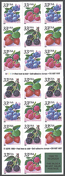 | Official Announcement | The Postal Service will issue four 33-cent Fruit Berries Definitive Stamp (Item Number 775700) in Ponchatoula, LA, on April 10, 1999. The Fruit Berries stamps were designed by Howard Paine of Delaplane, VA, and illustrated by Ned Seidler of Hampton Bay, NY, and go on sale nationwide April 11, 1999. |