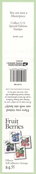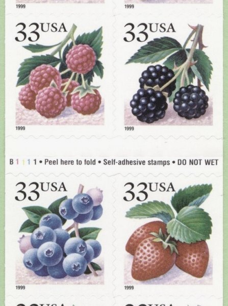 | Official Announcement | The Postal Service will issue four 33-cent Fruit Berries Definitive Stamp (Item Number 775700) in Ponchatoula, LA, on April 10, 1999. The Fruit Berries stamps were designed by Howard Paine of Delaplane, VA, and illustrated by Ned Seidler of Hampton Bay, NY, and go on sale nationwide April 11, 1999. |
