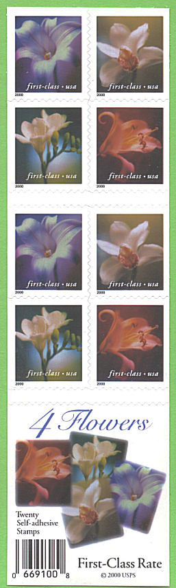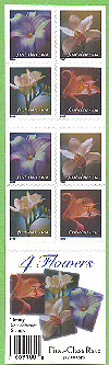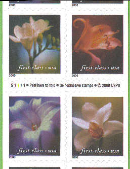 | Official Announcement | The Postal Service will issue Flowers nondenominated definitive stamps in Washington, DC , on December 15, 2000. The stamps will be issued in a self-adhesive booklet of 20 (Item Number 669100), a self-adhesive vending book of 20 (Item Number 669300), and a self-adhesive coil of 100 (Item Number 778900). These stamps, designed by Derry Noyes of Washington, DC, are based on photographs by Robert Peak of Winter Park, FL. The stamps go on sale nationwide December 15, 2000. The photographs by Robert Peak capture the color and delicacy of four different cut flowers - a freesia, a cymbidium orchid, and two lilies. In his 25 years of artistic endeavors, Peak has been recognized and honored as a photographer, designer, and filmmaker. His fine art photographs have been featured in major publications and appear in collections worldwide. |