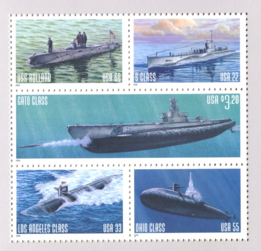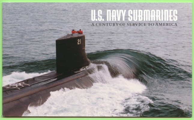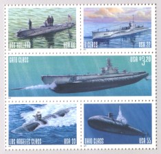 Official Announcement | The Postal Service will issue a $9.80 U.S. Navy Submarines prestige booklet of 10 commemorative stamps (Item Number 990200), in Groton, CT, on March 27, 2000. The stamp booklet, designed by Carl Herrman of Carlsbad, CA, and illustrated by James Griffiths of Glenview, IL, goes on sale nationwide March 28, 2000. These five stamp designs depict different periods in submarine technology. In 1900, with the purchase of USS Holland, the U.S. Navy acquired its first submarine. The S class submarine shows the change in technology and size that occurred after USS Holland. The Gato class submarine represents the contributions that submarines made to American naval superiority in the Pacific during World War II. The Ohio class submarine is 560 feet long with 24 Trident ballistic missiles and represents an ever-present deterrent to possible military aggression. Los Angeles class attack submarines are nuclear powered. The Los Angeles Class commemorative stamp depicted in this booklet can be purchased separately (Item Number 450100). |