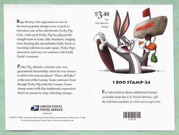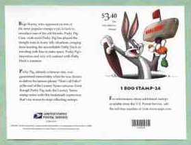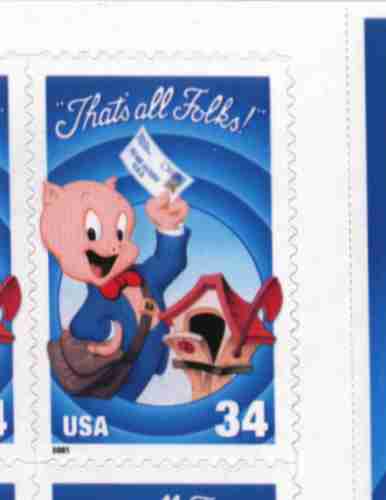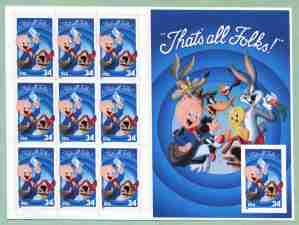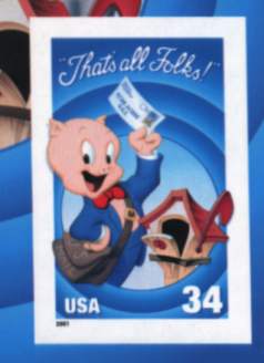 Official Announcement | The Postal Service will issue a 34-cent "That's All Folks!" commemorative stamp (Item Number 560200) in Beverly Hills, California, on October 1, 2001. The stamp, designed and illustrated by Ed Wleczyk of Los Angeles, California, goes on sale nationwide October 2, 2001. The stamp will be produced in souvenir sheets of 10; the souvenir sheet may not be split and the stamps may not be sold individually. The first true star of the Looney Tunes case, Porky Pig is popular with audiences of all ages and has appeared in more than 160 cartoons. Porky Pig experienced several changes in his early years appearing as child, father, and young suitor in succeeding cartoons. Later, he became a more consistent personality with a gentle stammer, wide-eyed appearance, and boyish nature. Eventually, Porky Pig was redesigned as a more adult-looking character and cast as a wry foil for the silly Daffy Duck. Porky Pig, already a famous star, was guaranteed immortality when he was chosen to deliver his famous phrase "That's all Folks!" at the end of the LooneyTunes cartoons. Porky Pig completes the Postal Service's Looney Tunes series. |