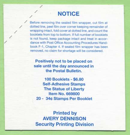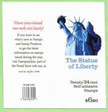 Official Announcement | The Postal Service will issue a Statue of Liberty 34-cent definitive stamp in New York, NY 10199, on February 7, 2001. The stamp, designed by Derry Noyes of Washington, DC, is based on a photograph by Paul Hardy of New York, NY, and goes on sale nationwide February 8, 2001. This stamp will be issued in six formats: a convertible booklet of 20 (Item Number 669800); a convertible booklet of 10 (Item Number 669500); a vending booklet of 20(Item Number 669000); a self-adhesive coil of 100 (Item Number 771300); a water-activated coil of 10,000 (Item Number 773800); and a water-activated coil of 3,000 (Item Number 773700). The Statue of Liberty, a gift of friendship from the people of France to the people of the United States, has become a symbol of freedom and democracy. Located in New York Harbor, the statue was dedicated on October 28, 1886, and designated a National Monument on October 15, 1924. This stamp was issued in several nondenominated formats in December 2000. |