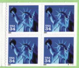 | Official Announcement | The Postal Service will issue a Statue of Liberty 34-cent definitive stamp in New York, NY 10199, on February 7, 2001. The stamp, designed by Derry Noyes of Washington, DC, is based on a photograph by Paul Hardy of New York, NY, and goes on sale nationwide February 8, 2001. This stamp will be issued in six formats: a convertible booklet of 20 (Item Number 669800); a convertible booklet of 10 (Item Number 669500); a vending booklet of 20(Item Number 669000); a self-adhesive coil of 100 (Item Number 771300); a water-activated coil of 10,000 (Item Number 773800); and a water-activated coil of 3,000 (Item Number 773700). The Statue of Liberty, a gift of friendship from the people of France to the people of the United States, has become a symbol of freedom and democracy. Located in New York Harbor, the statue was dedicated on October 28, 1886, and designated a National Monument on October 15, 1924. This stamp was issued in several nondenominated formats in December 2000. |