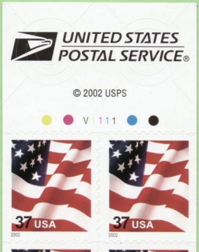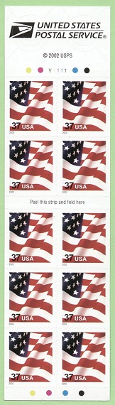 | Marginal Markings | USPS Logo, © 2002 USPS, 4 colored dots (twice), Plate Number, "Peel this strip and fold here" |