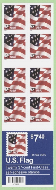 | Official Announcement | The Postal Service will issue a 37-cent U.S. Flag definitive stamp on June 7, 2002, in Washington, DC. The stamp was designed and illustrated by Terrence W. McCaffrey, U.S. Postal Service, Washington, DC. No official ceremony is planned. The stamp will be issued in a pressure-sensitive adhesive (PSA) convertible book of 18 (Item 562600); PSA pane of 20 (Item 562900); PSA convertible book of 10 (Item 670600); PSA vending book of 20 (Item 670700); PSA double-sided book of 20 (Item 670800); PSA convertible book of 20 (Item 670900); PSA coil of 100 (Item 780100); PSA coil of 3,000 (Item 780200); PSA coil of 10,000 (Item 780300); water-activated gum (WAG) coil of 100 (Item 780500); WAG coil of 3,000 (Item 780600); and WAG coil of 10,000 (Item 780700). Items 780300 and 780600 will be available for nationwide sale on June 7, 2002. Items 562600, 562900, 670600, 670700, 670800, 670900, 780100, 780200, 780500 and 780700 will be available for sale at a later date. The stars and stripes of "Old Glory" are featured on this definitive stamp. |