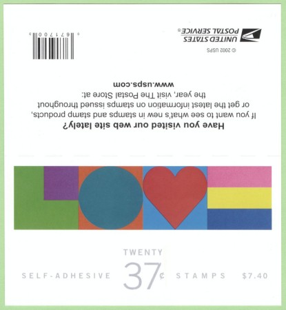| Official Announcement | The Postal Service will issue 37-cent and 60-cent Love special stamps, on August 16, 2002, in Atlantic City, New Jersey. The 37-cent Love stamp is produced as a $7.40 pressure-sensitive adhesive (PSA) convertible booklet of 20 (Item 671700), and the 60-cent (2-ounce rate) Love stamp is produced as a PSA pane of 20 (Item 562800). The 60-cent Love pane of 20 may be split, and the stamps may be sold individually. The stamps, designed by Michael Osborne, San Francisco, California, will go on sale nationwide on August 17, 2002. The stamps feature a colorful abstract design in multiple colors. The first Love stamp was issued by the Postal Service in 1973. Since that time, Love stamps have featured a wide range of subjects including flowers, animals, cherubs, and love letters, as well as abstract designs. |