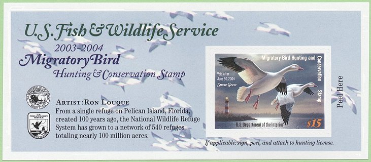 | Inscription | FRONT: "Migratory Bird Hunting and Conservation Stamp. Void after June 30, 2004, $15, Snow Geese, U.S. Department of the Interior." |