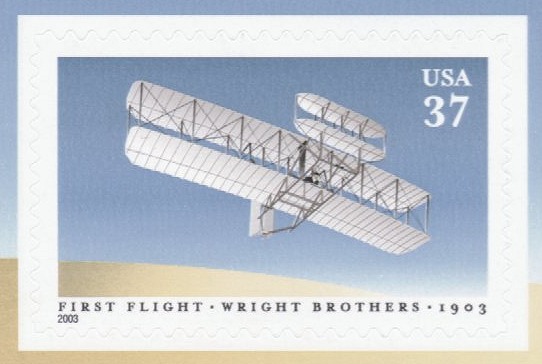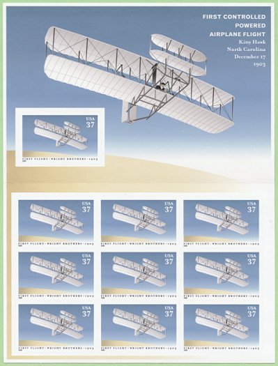 Official Announcement | The Postal Service will issue a 37-cent First Flight commemorative stamp (Item 563900) in a pressure-sensitive adhesive (PSA) souvenir sheet of 10 stamps on May 22, 2003, in Dayton, Ohio, and Kill Devil Hills, near Kitty Hawk, North Carolina. The stamp, designed and illustrated by McRay Magleby, goes on sale nationwide May 23, 2003. This $3.70 souvenir sheet may not be split and the stamps may not be sold individually. The souvenir sheet commemorates the 100th anniversary of the first controlled, powered, and sustained flight in a heavier-than-air flying machine. At Kill Devil Hills on December 17, 1903, Wilbur and Orville Wright successfully tested a flyer with a four-cylinder engine. During the first flight, the craft was airborne only for an estimated 12 seconds and traveled only 120 feet, but three even more successful flights followed later that day, the remarkable prelude to a century that would see the world forever changed by air travel. |
