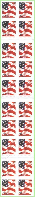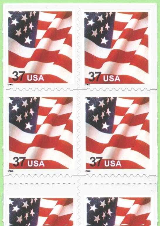 | Note from Donna Rajotte | Some differences between this version and the original Sennett Security printing: The flag image on the new version is much sharper. The new Avery version has a perf gauge of 11.2 x 11 and has a small 2003 date, the original measures 10.5 x 10.8 with a larger 2002 date. Also the die-cut at the intersection of four stamps is more of a straight line than on the Sennett version. The front cover of the Avery booklet has a much larger picture of the stamp, a small 2003 date, and no line through the 37 unlike the Sennett issue. The back cover has a larger bar code, larger USPS item number, and the plate number V1111 in the white box containing the barcode and item number. |
