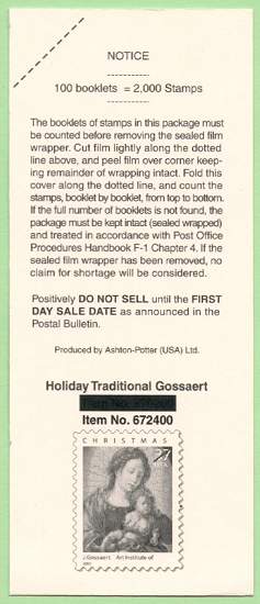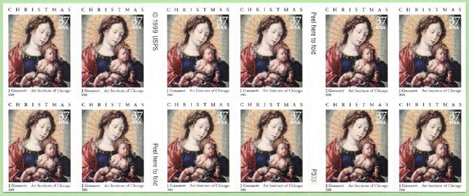 | Official Announcement | The Postal Service will issue a 37-cent Madonna and Child stamp (Item 672400) in a pressure-sensitive adhesive (PSA) pane of 20 stamps on October 23, 2003, in New York, New York. The stamp, designed by Richard Sheaff, Scottsdale, Arizona, and based on the artwork of Jan Gossaert, goes on sale nationwide October 24, 2003. The Madonna and Child stamp (formerly known as Holiday Traditional) has attracted a devoted following. This Christmas series stamp is a detail of Jan Gossaert's oil-on-panel painting of the Madonna and Child, circa 1520, from the Charles H. and Mary F. S. Worcester Collection at The Art Institute of Chicago. The Madonna and Child stamp was previously issued on October 10, 2002, in a convertible booklet of 20 stamps (670200). |