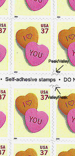 | Note | Horizontal Die cuts on the top block of ten stamps are peak/valley, while the die cuts on the bottom block of ten stamps are valley/peak. Click here for a detail scan. |