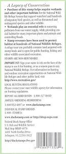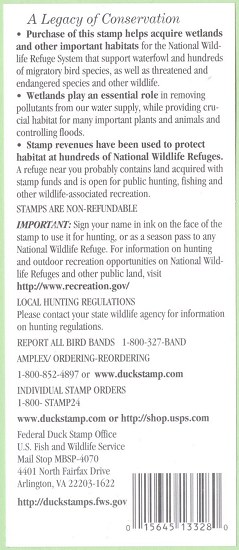| Official Announcement | The $15 Migratory Bird Hunting and Conservation stamp for the 2004-2005 season goes on sale at Post Offices nationwide July 1, 2004, and is valid through June 30, 2005. The U.S. Department of the Interior will formally issue the stamp at the National Postal Museum in Washington, DC, on July 1, 2004. The Migratory Bird Hunting and Conservation stamp will be issued in two formats: (1) in the traditional water-activated gum (WAG) pane of 20 stamps (Item 332900), and (2) in a pressure-sensitive adhesive (PSA) single stamp (Item 332800). The stamp size in the PSA version is the same size as the WAG version and can be peeled from its carrier sheet. The carrier sheet is the size of U.S. paper currency and fits easily in cash drawers. Postmasters should order enough of Items 332800 and 332900 to meet the expected demand for this item by stamp collectors, conservationists, and hunters. |