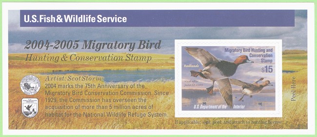 | Inscription | FRONT: "Migratory Bird Hunting and Conservation Stamp. Void after June 30, 2005, $15, Redheads, U.S. Department of the Interior." |
