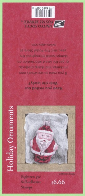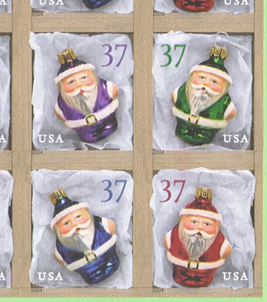 Official Announcement | The Postal Service will issue 37-cent, Holiday Ornaments special stamps in four designs in a pressure-sensitive adhesive (PSA) pane of 20 stamps (Item 566400), on November 16, 2004, in New York, New York. The stamps, designed by Derry Noyes of Washington, DC, go on sale nationwide November 17, 2004. The stamps feature photographs by Sally Andersen- Bruce of painted glass Santa ornaments. The ornaments were made in 1999 in Lauscha, Germany, for D. Blümchen & Company of Ridgewood, New Jersey, and were hand- painted by designer Diane S. Boyce. Nestled in tissue paper, these shiny Santas evoke happy memories of lights, tinsel, and other favorite Christmas tree decorations. The stamps will also be issued in a double-sided booklet of 20 (Item 673200), a folded vending book of 20 (Item 673300), and an ATM sheetlet of 18 stamps (Item 566900). |