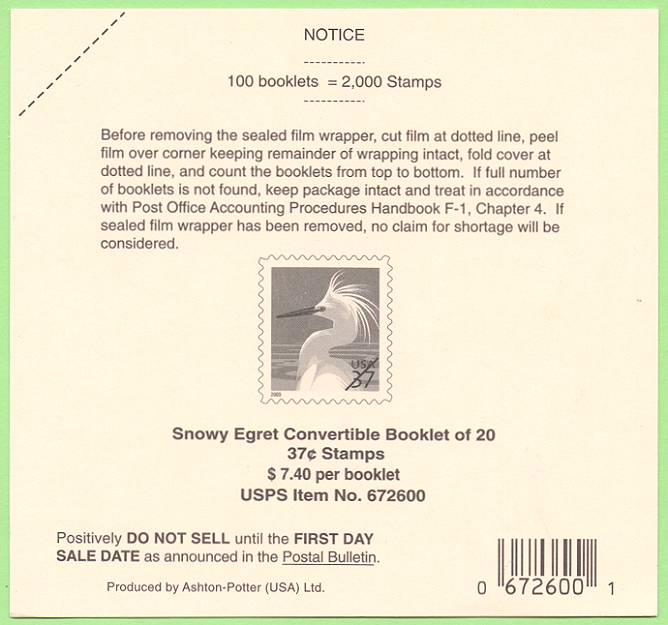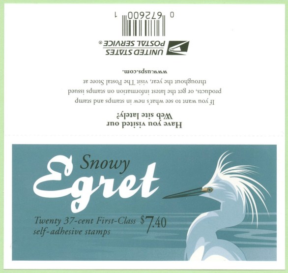| Official Announcement | The Postal Service will issue a 37-cent Snowy Egret definitive stamp (Item 672600) in a pressure-sensitive adhesive (PSA) convertible booklet of 20 on January 30, 2004, in Norfolk, Virginia. The stamp, designed by Carl T. Herrman, Carlsbad, California, goes on sale nationwide January 31, 2004. The Snowy Egret stamp features artist Nancy Stahl's rendering of a snowy egret, which is considered one of the most beautiful American birds. The stamp art, based on photographs, depicts the head and upper body of a snowy egret against a blue background. This stamp was issued in a coil of 100 on October 24, 2003, in New York, New York. |