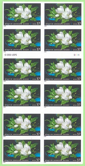 | Official Announcement | The Postal Service will issue a 37-cent, Martin Johnson Heade, Giant Magnolias on a Blue Velvet Cloth commemorative stamp (Item 673100) in a pressure-sensitive adhesive (PSA) double-sided book of 20 on August 12, 2004, in Sacramento, California. The stamp, designed by Derry Noyes of Washington, DC, goes on sale nationwide August 13, 2004. Inaugurated in 2001 with the Amish Quilts stamp pane, the American Treasures series showcases beautiful American fine art and crafts. The 2002 and 2003 issuances featured artwork by John James Audubon and Mary Cassatt, respectively. For this fourth issuance in the American Treasures series, art director Derry Noyes chose Giant Magnolias on a Blue Velvet Cloth, a circa 1890 oil-on-canvas by Martin Johnson Heade. The painting is in the collection of the National Gallery of Art in Washington, DC. |