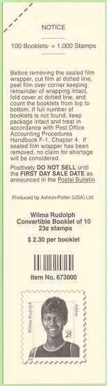 | Official Announcement | The Postal Service will issue a 23-cent, Wilma Rudolph definitive stamp on July 14, 2004, in Sacramento, California. The stamp, designed by Richard Sheaff of Scottsdale, Arizona, goes on sale nationwide July 15, 2004. With this fifth issuance in the Distinguished Americans series, the Postal Service honors Wilma Rudolph, who overcame a childhood plagued by serious illness to become one of the nation's greatest athletes. Artist Mark Summers created the portrait for the stamp using as a reference a photograph of Rudolph taken after she won three gold medals at the 1960 Olympic Games in Rome. Summers also created the stamp art for the first four issuances in the Distinguished Americans series: Joseph W. Stilwell (2000), Claude Pepper (2000), Hattie W. Caraway (2001), and Edna Ferber (2002). The Wilma Rudolph stamp will be issued in a pressure-sensitive adhesive (PSA) pane of 20 stamps (Item 108400), a PSA vending booklet of 10 stamps (Item 672900), and a PSA convertible booklet of 10 stamps (Item 673000). |