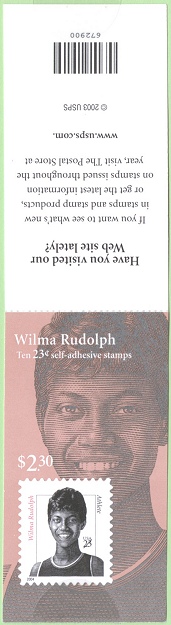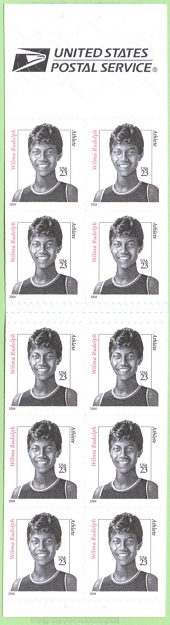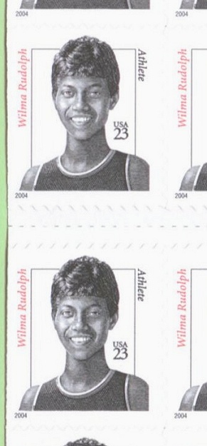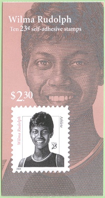 | Official Announcement | The Postal Service will issue a 23-cent, Wilma Rudolph definitive stamp on July 14, 2004, in Sacramento, California. The stamp, designed by Richard Sheaff of Scottsdale, Arizona, goes on sale nationwide July 15, 2004. With this fifth issuance in the Distinguished Americans series, the Postal Service honors Wilma Rudolph, who overcame a childhood plagued by serious illness to become one of the nation's greatest athletes. Artist Mark Summers created the portrait for the stamp using as a reference a photograph of Rudolph taken after she won three gold medals at the 1960 Olympic Games in Rome. Summers also created the stamp art for the first four issuances in the Distinguished Americans series: Joseph W. Stilwell (2000), Claude Pepper (2000), Hattie W. Caraway (2001), and Edna Ferber (2002). The Wilma Rudolph stamp will be issued in a pressure-sensitive adhesive (PSA) pane of 20 stamps (Item 108400), a PSA vending booklet of 10 stamps (Item 672900), and a PSA convertible booklet of 10 stamps (Item 673000). |