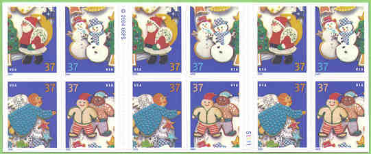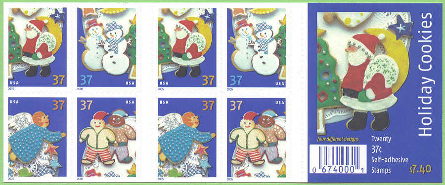 | Official Announcement | The Postal Service ™ will issue 37-cent, Holiday Cookies special stamps in four designs, on October 20, 2005, in Minneapolis, Minnesota, and New York, New York (Mega Stamp Show). The stamps designed by Derry Noyes of Washington, DC, go on sale nationwide on October 21, 2005.In celebration of the winter holiday season, the stamps feature festively decorated cookies. Two snowmen, two elves (one sugar cookie and one gingerbread), an angel, and Santa Claus are all part of the delicious fun, adding homemade warmth to seasonal correspondence. The stamps will be issued in a pressure-sensitive adhesive (PSA) pane of 20 stamps (Item 567500), a double- sided booklet of 20 stamps (Item 674000), and a folded vending booklet of 20 stamps (Item 674100). |