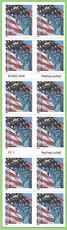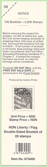 • Plate numbers Cover Side: Barcode 674400 • "Lady Liberty and U.S. Flag" • Stamp image • "Twenty First-Class Self-adhesive Stamps" • "Peel here to fold" |