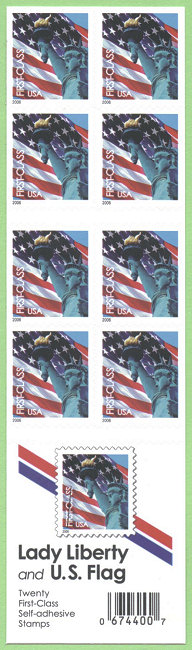 • Plate numbers Cover Side: Barcode 674400 • "Lady Liberty and U.S. Flag" • Stamp image • "Twenty First-Class Self-adhesive Stamps" |