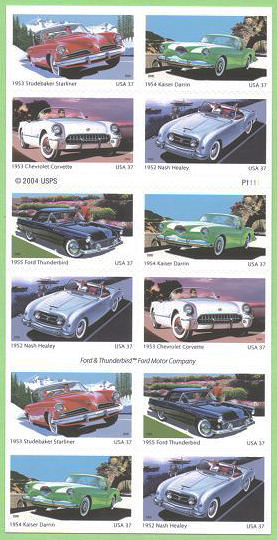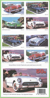 | Official Announcement | The Postal Service ™ will issue 37-cent, America on the Move: 50s Sporty Cars commemorative stamps in five designs on August 20, 2005, in Detroit, Michigan. The stamps, designed by Art M. Fitzpatrick of Carlsbad, California, go on sale nationwide August 21, 2005.The America on the Move: 50s Sporty Cars will be issued in a pressure-sensitive adhesive (PSA) double- sided convertible booklet of 20 (Item 673800) and a booklet of 20 stamped cards (Item 980700). These five stamps feature the sporty look of American cars designed in the 1950s - a decade marked by post- World War II euphoria and economic prosperity. The cars selected are: • 1952 Nash Healey • 1953 Chevrolet Corvette • 1953 Studebaker Starliner • 1954 Kaiser Darrin • 1955 Ford Thunderbird. Referring to photographs of each car and his own cache of landscape images for the stamp backgrounds, artist Art M. Fitzpatrick has rendered each stamp in meticulous detail. Fitzpatrick was once a car designer and a long-time advertising designer and illustrator for General Motors. |