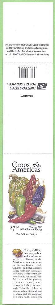 2005 USPS · Plate numbers Cover Side: "Crops of the Americas" · Crops image · © 2005 USPS · Barcode (675700) · "Twenty 39-cent Self-adhesive Stamps" · "$7.80" · Five Different Designs · Descriptive text · Promotional information · USPS Logo |