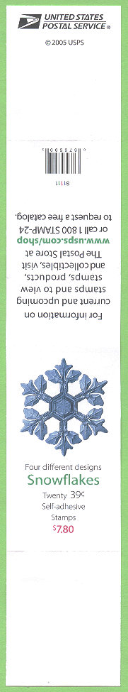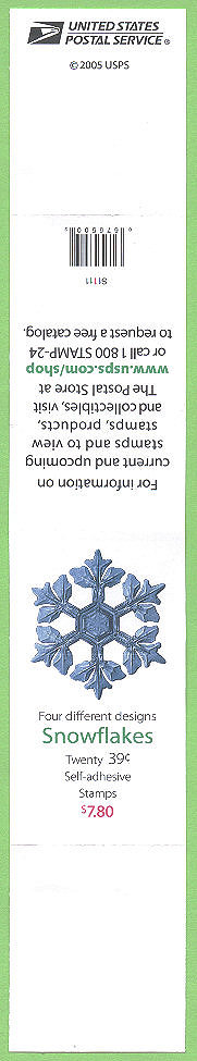 | Margin Markings | Cover Side: Stamp Image • "© 2005 USPS • Plate Numbers • "Snowflakes" • "Twenty 39 cent Self-adhesive Stamps" • "Four Different Designs" • Price "$7.80" • Barcode "675500" • Website address • Promotional text • USPS Logo |