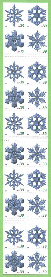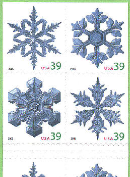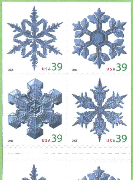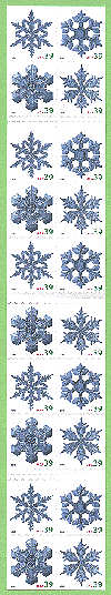 In celebration of the winter holiday season, the Postal Service will produce these four stamps featuring photographs of snowflakes. The stamps are photographs of two basic snowflake patterns by physicist Kenneth Libbrecht of Pasadena, California. The patterns are stellar dendrites, which form branching treelike arms and sectored plates, which form platelike arms. Because fallen snowflakes start to melt and lose their shape in mere minutes, Libbrecht quickly transferred the snowflakes from cardboard to a glass slide using a paintbrush. He then snapped the photos inside a temperature-regulated enclosure using a digital camera attached to a high-resolution microscope. The stamps will be issued in a pressure-sensitive adhesive (PSA) pane of 20 stamps (Item 568600), a double- sided booklet of 20 stamps (Item 675600), a folded vending booklet of 20 stamps (Item 675500), and an ATM sheetlet of 18 stamps (Item 569400). |