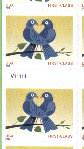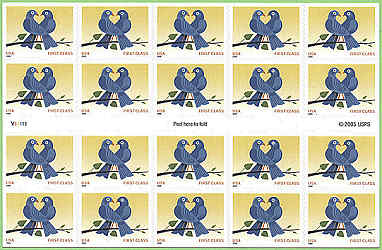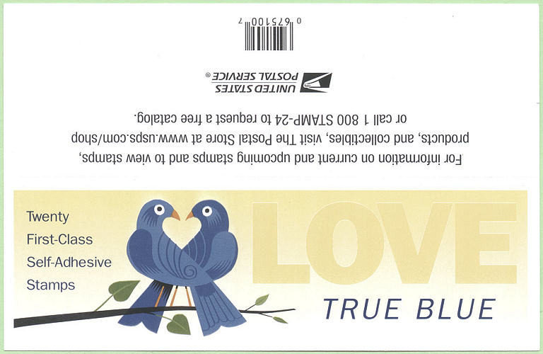 The Postal Service™ will issue a First-Class® nondenominated definitive stamp Love: True Blue on January 3, 2006, in Washington, DC. The stamp, designed by Craig Frazier of Mill Valley, California, goes on sale nationwide January 3, 2006. The stamp will be issued in a pressure-sensitive adhesive (PSA) convertible booklet of 20 (Item 675100). Illustrator Craig Frazier arranged paper cutouts into a composition depicting two birds perched on a branch sharing a devoted gaze - the space between them forms a heart. He then created a digital file of the artwork and applied shades of blue to the birds, setting them against a yellow background. End Card |