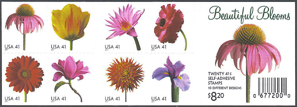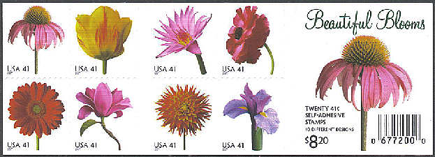 Cover Side: Barcode (677200) • “Beautiful Blooms” • Stamp image • Price