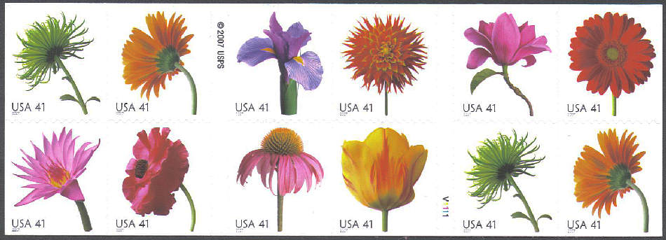 “$8.20” • “TWENTY 41¢ SELF-ADHESIVE STAMPS” • “10 DIFFERENT DESIGNS” Stamp Side: © 2007 USPS in peel strip area • Plate numbers V1111 in peel strip area Earliest Known Use |