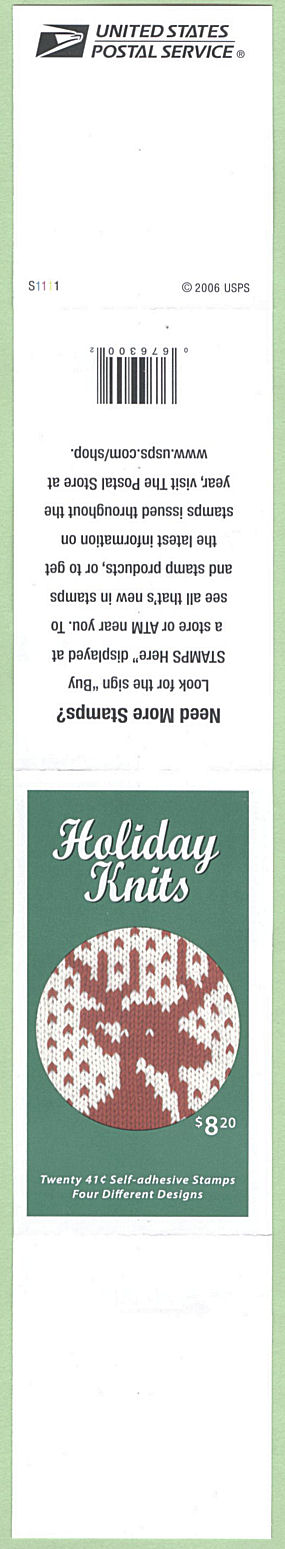 | Markings | © 2006 USPS • Plate numbers • USPS logo • Barcode “676300” • Partial stamp image • Promotional material • Web site • Header “Holiday Knits” • Price “$8.20” • “Twenty 41¢ Self-adhesive Stamps Four Different Designs” | ||||