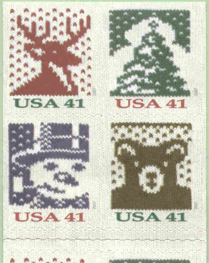 York, the Postal In celebration of the winter holiday season, the Postal Service will produce these four stamps featuring classic Christmas-time imagery designed and machine knitted by nationally known illustrator Nancy Stahl of New York, New York. Inspired by traditional Norwegian sweaters and knitted Christmas stockings, Stahl decided on “something cozy” for this year’s holiday stamp issuance. There’s a dignified stag, a snow-dappled evergreen tree, a perky snowman sporting a top hat, and a whimsical teddy bear, each of which is sure to add an extra touch of warmth to seasonal correspondence. The stamps will be issued in the following formats: