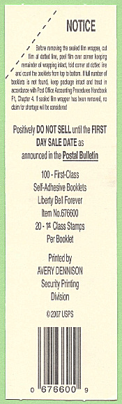 numbers Cover side: Barcode 676600 • Stamp Image • "FOREVER" • "Twenty First-Class Stamps" |