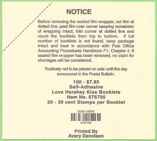 | Margin Markings | Cover Side: ©2006 USPS • Plate numbers • $7.80 • USPS logo • Promotional text • "HERSHEY'S, KISSES, the plume and the product configuration are registered trademarks used with permission from The Hershey Company" • Barcode 676700 • "Love KISSES" • Stamp image • "Twenty 39 Self-adhesive Stamps" | ||||||
