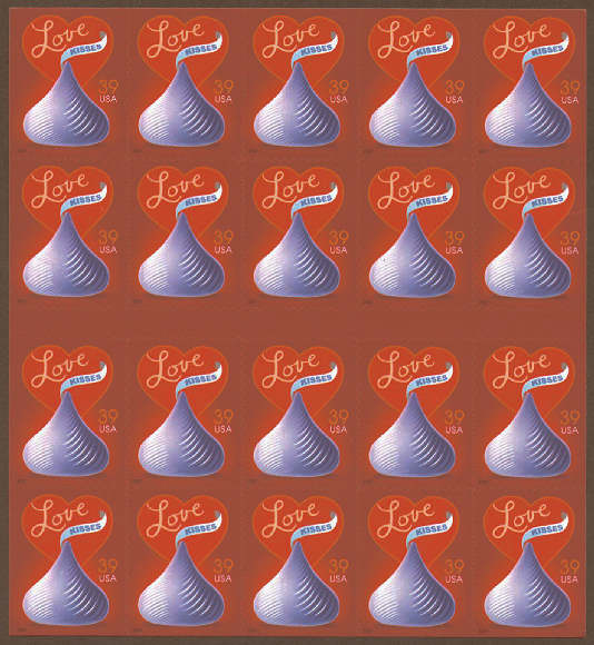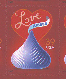 The Postal ServiceTM will issue a 39-cent With Love and Kisses special stamp in one design in a pressure-sensitive adhesive (PSA) convertible booklet of 20 (Item 676700), on January 13, 2007, in Hershey, Pennsylvania. The stamp, designed by Derry Noyes of Washington, DC, also goes on sale nationwide January 13, 2007. The stamp features a silver Hershey's Kisses chocolate on a deep red background. The shape of the Kisses chocolate mirrors the form of the passionate red heart that rises behind it. Written on the heart is "Love" while "Kisses" appears on the plume that extends from the top of the chocolate treat. The stamp also commemorates the 100th anniversary of Hershey's Kisses in 2007. Note |