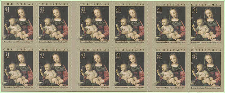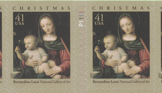 On October 25, 2007, in New York, New York, the Postal Service™ will issue a 41-cent Christmas: The Madonna of the Carnation by Bernardino Luini special stamp in one design in a pressure-sensitive adhesive (PSA) double-sided book of 20 stamps (Item 676200). Designed by Richard Sheaff of Scottsdale, Arizona, the stamp goes on sale nationwide October 25, 2007. The stamp features an oil-on-panel painting entitled The Madonna of the Carnation by Milanese painter Bernardino Luini (circa 1480–1532). Dating to around 1515, the painting is now part of the Samuel H. Kress Collection at the National Gallery of Art in Washington, DC. The stamp art is considered a detail of the painting, as the original photograph was slightly cropped on all four sides to fit the stamp format. |