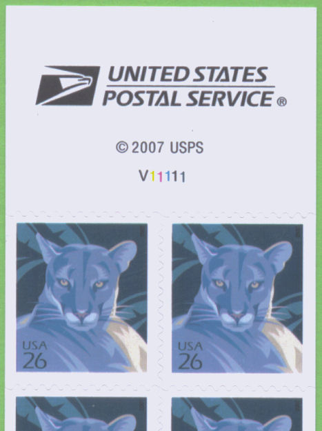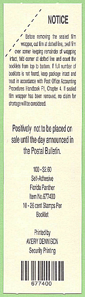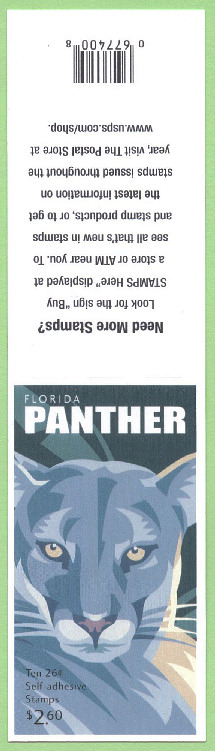 | Markings | Stamp Side: © 2007 USPS • USPS Logo • Plate numbers Cover Side: Header “FLORIDA PANTHER” • Barcode “677400” • “Ten 26¢ Self-adhesive Stamps $2.60” • Promotional paragraph |
